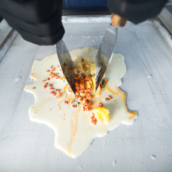Quá trình chế biến kem cuộn là một màn trình diễn thực sự. Người chế biến trình bày kỹ thuật điêu luyện tinh tế để trộn. Dàn mỏng và cuộn kem, đem lại sự thích thú cho người xem.