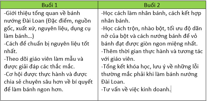 Khóa học làm bánh nướng Đài Loạn của chúng tôi gồm 2 buổi học: